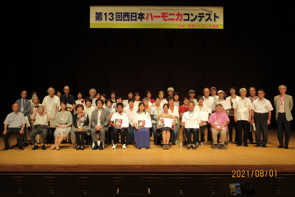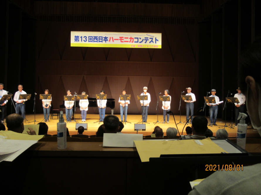 第13回西日本ハーモニカコンテスト(決勝ライブ)は8月1日(日)に堺市民芸術文化ホール(フェニーチェ堺)にて開催されました。猛暑とコロナ禍のなか、200席の会場を100席に制限して消毒と3密を避けるコロナ対策を行って、無事に開催されました。