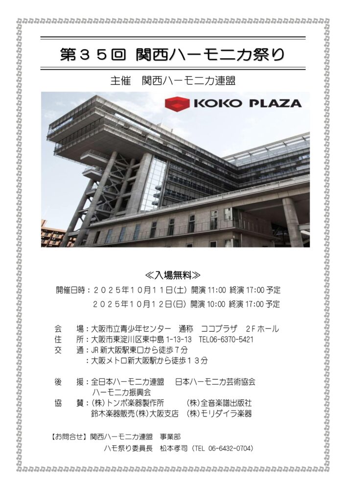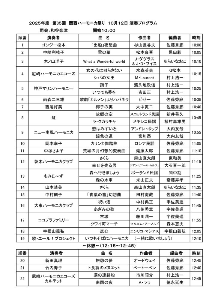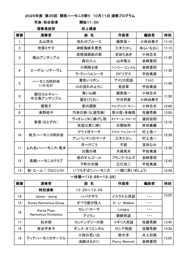 第35回関西ハーモニカ祭りのプログラムが以下の通り決定達しましたのでお知らせいたします。